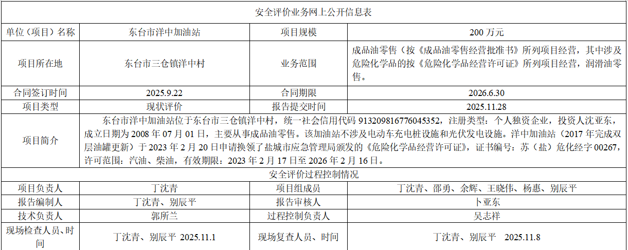 东台市洋中加油站安全现状评价报告