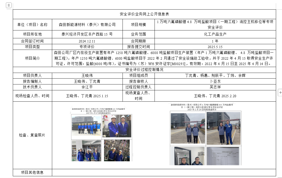 森田新能源材料(泰兴)有限公司1万吨六氟磷酸锂4.8 万吨盐酸项目(一期工程)消控主机移位等专项安全评价