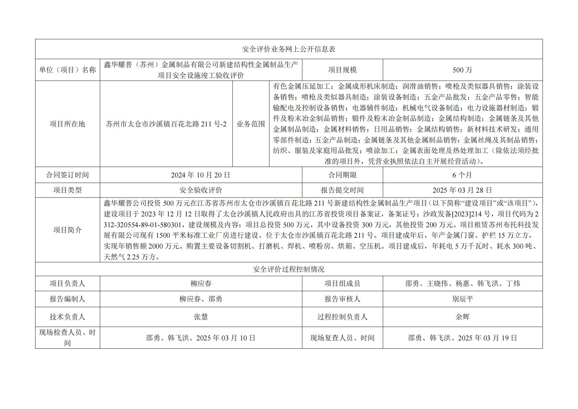 鑫华耀普(苏州)金属制品有限公司新建结构性金属制品生产项目安全设施竣工验收评价