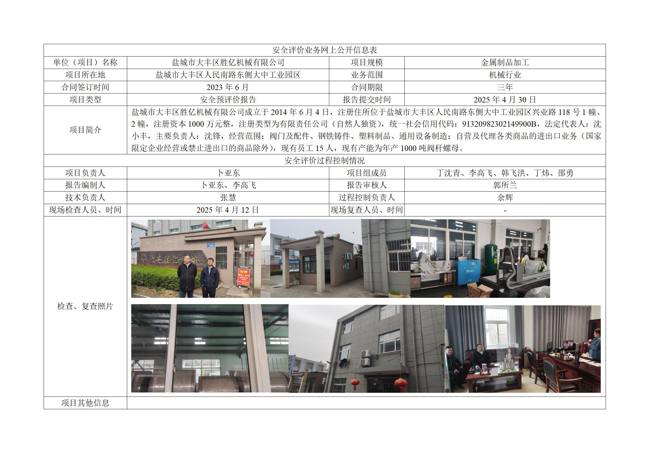 城市大丰区胜亿机械有限公司新建年产2000吨阀杆螺母项目安全预评价报告