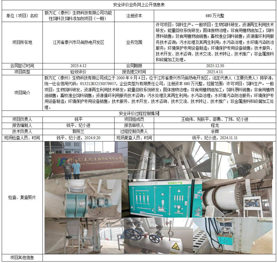 新方汇(泰州)生物科技有限公司功能性饲料及饲料添加剂项目(一期)安全验收