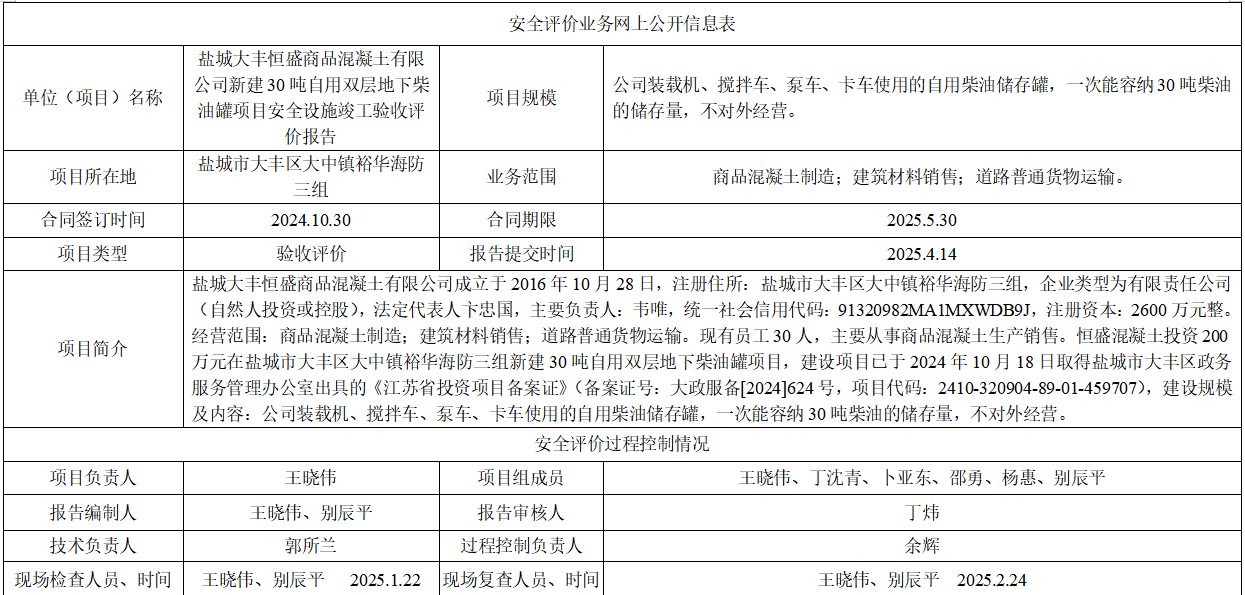 盐城大丰恒盛商品混凝土有限公司新建30吨自用双层地下柴油罐项目安全设施竣工验收评价报告