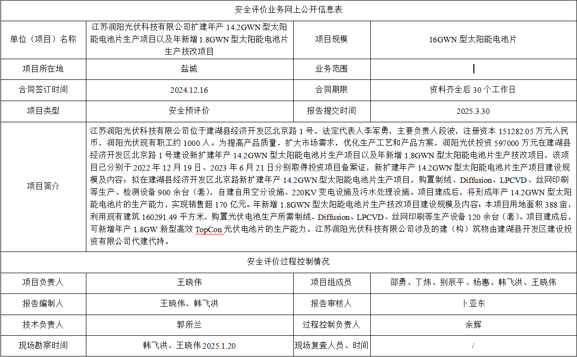 江苏润阳光伏科技有限公司扩建年产14.2GWN型太阳能电池片生产项目以及年新增1.8GWN型太阳能电池片生产技改项目