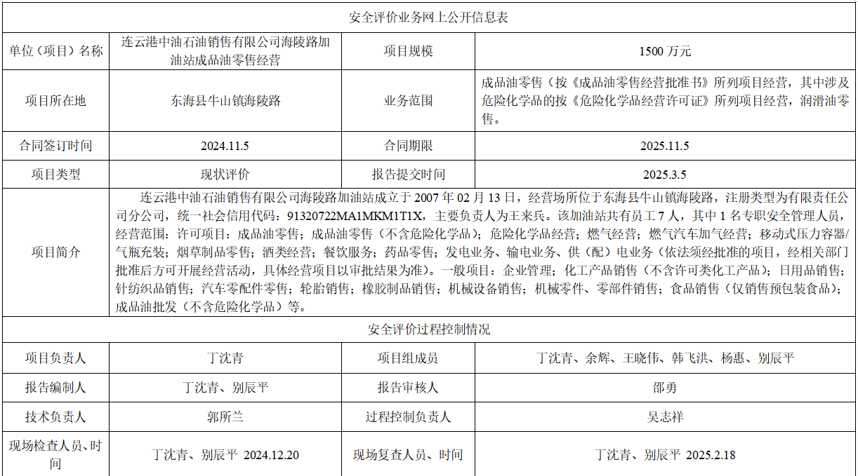 连云港中油石油销售有限公司海陵路加油站成品油零售经营项目安全评价报告