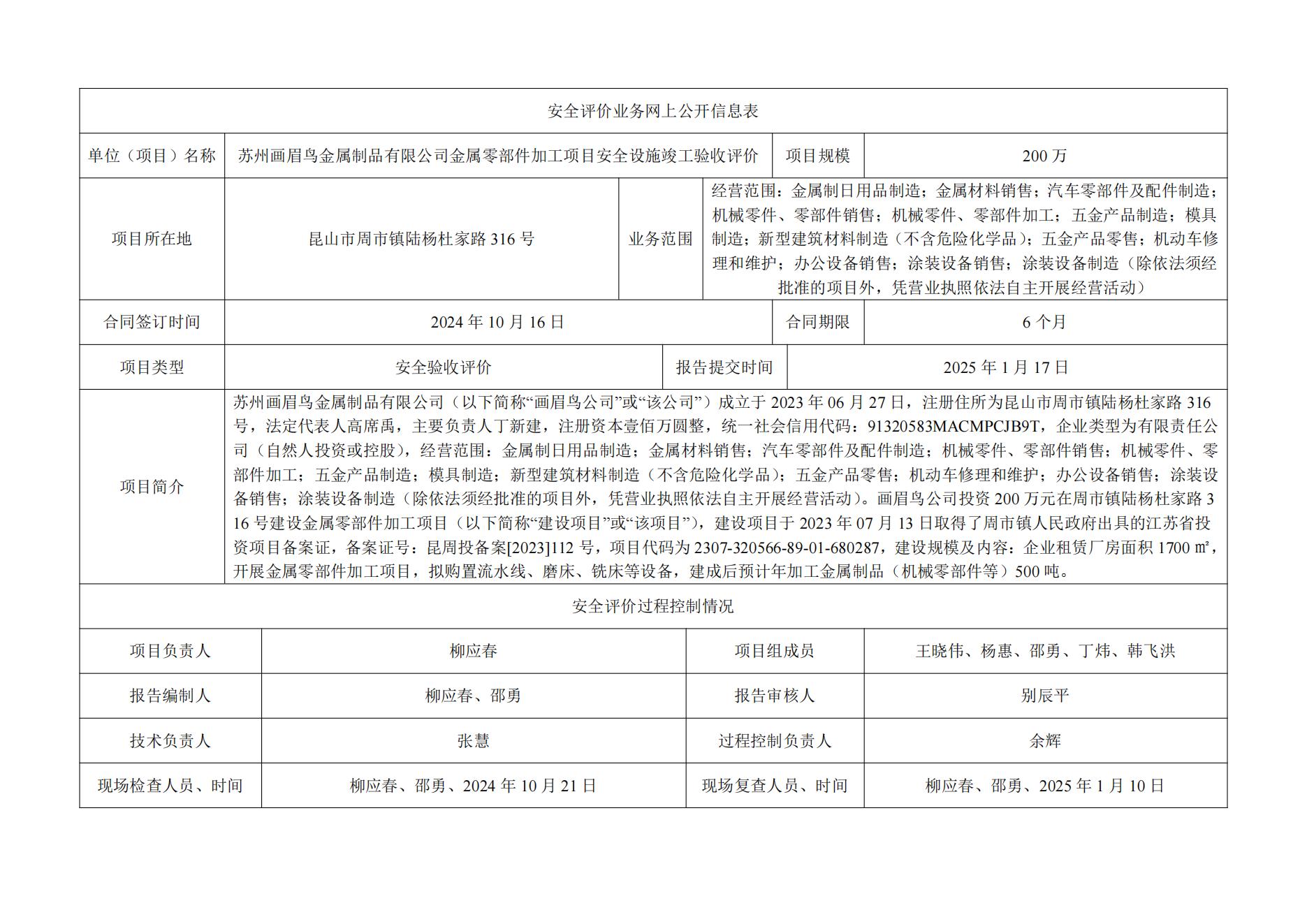 苏州画眉鸟金属制品有限公司金属零部件加工项目安全设施竣工验收评价
