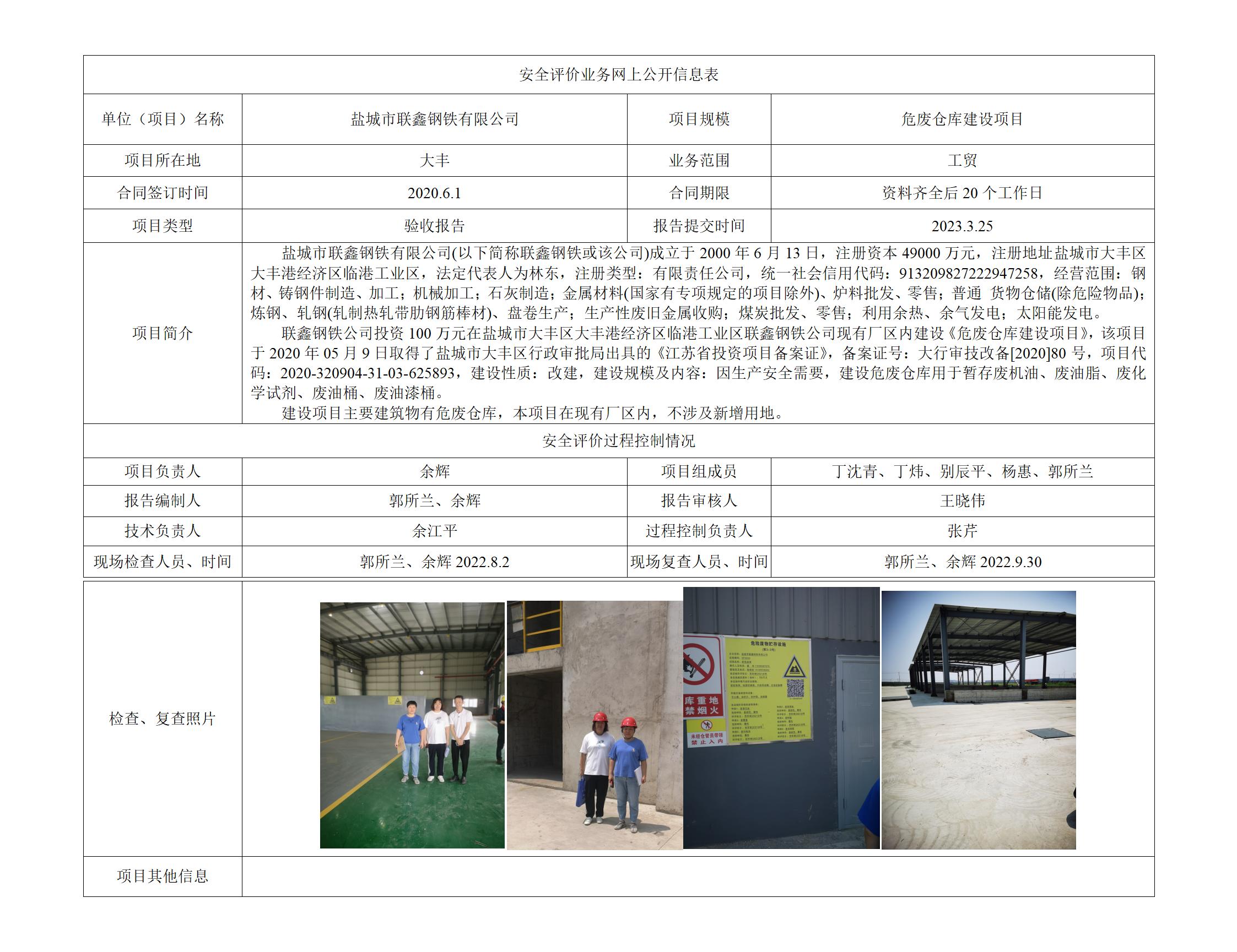 盐城市联鑫钢铁有限公司危废仓库建设项目安全设施竣工验收评价报告