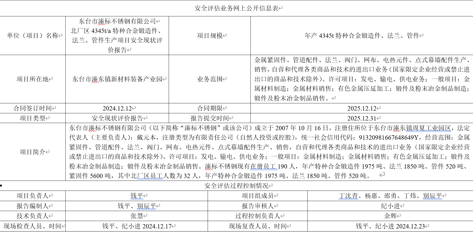 东台市溱标不锈钢有限公司 北厂区4345t/a特种合金锻造件、法兰、管件生产项目安全现状评价报告