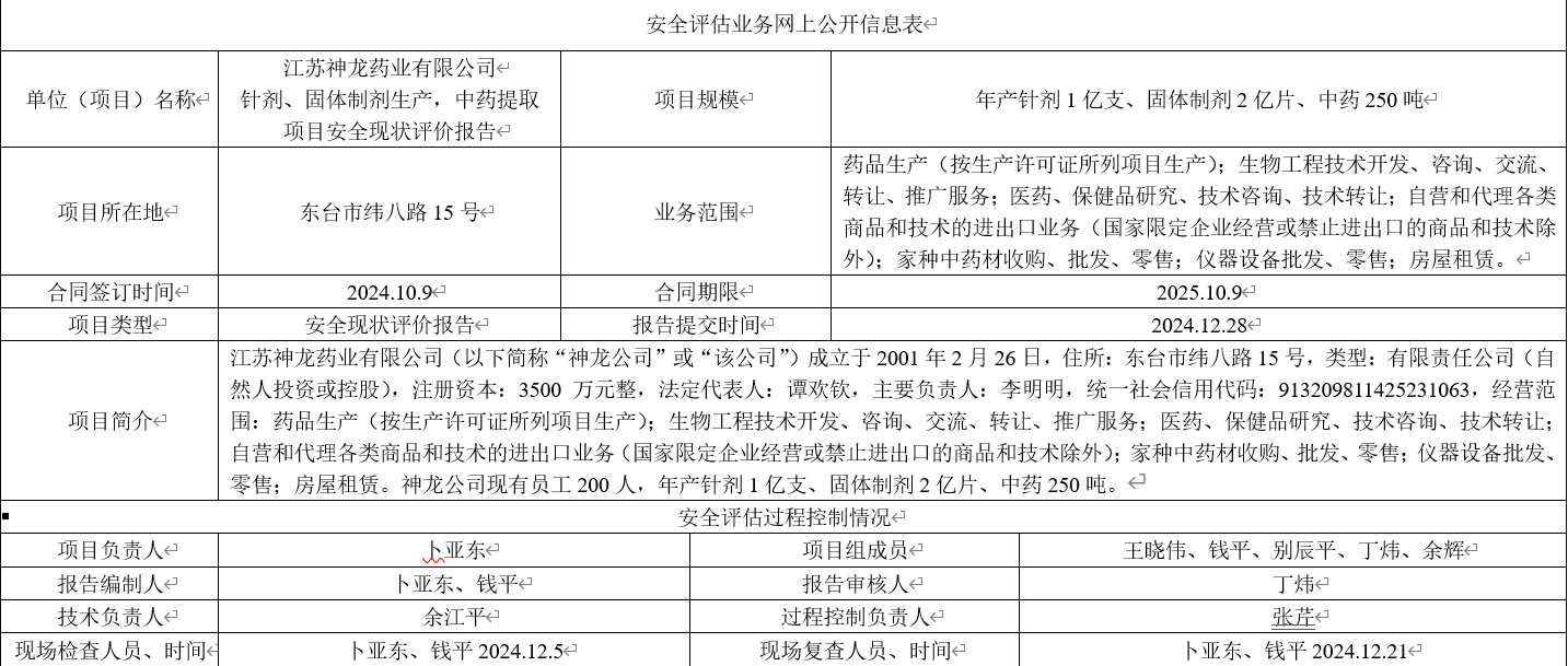 江苏神龙药业有限公司 针剂、固体制剂生产,中药提取项目安全现状评价报告