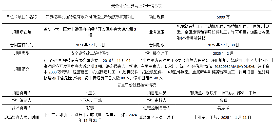 江苏港丰机械铸造有限公司铸造生产线技改扩建项目验收评价