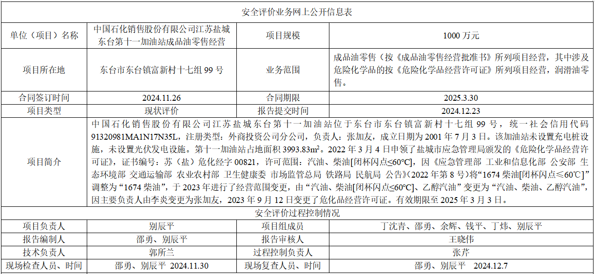 中国石化销售股份有限公司江苏盐城东台第十一加油站成品油经营项目安全评价报告