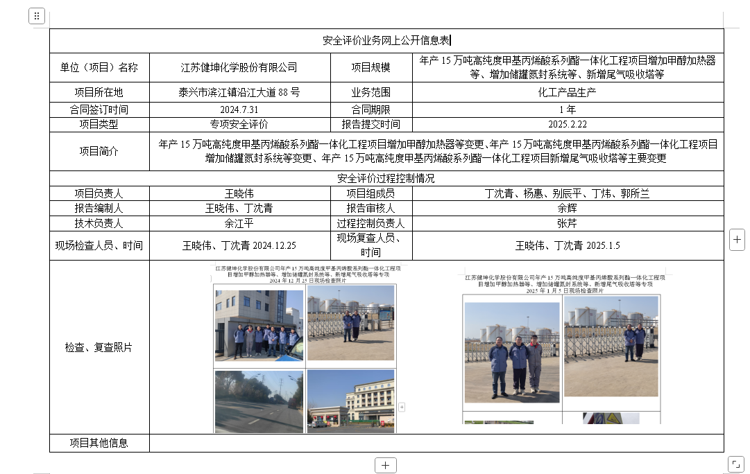 江苏健坤化学股份有限公司年产15万吨高纯度甲基丙烯酸系列酯一体化工程项目增加甲醇加热器等、增加储罐氮封系统等、新增尾气吸