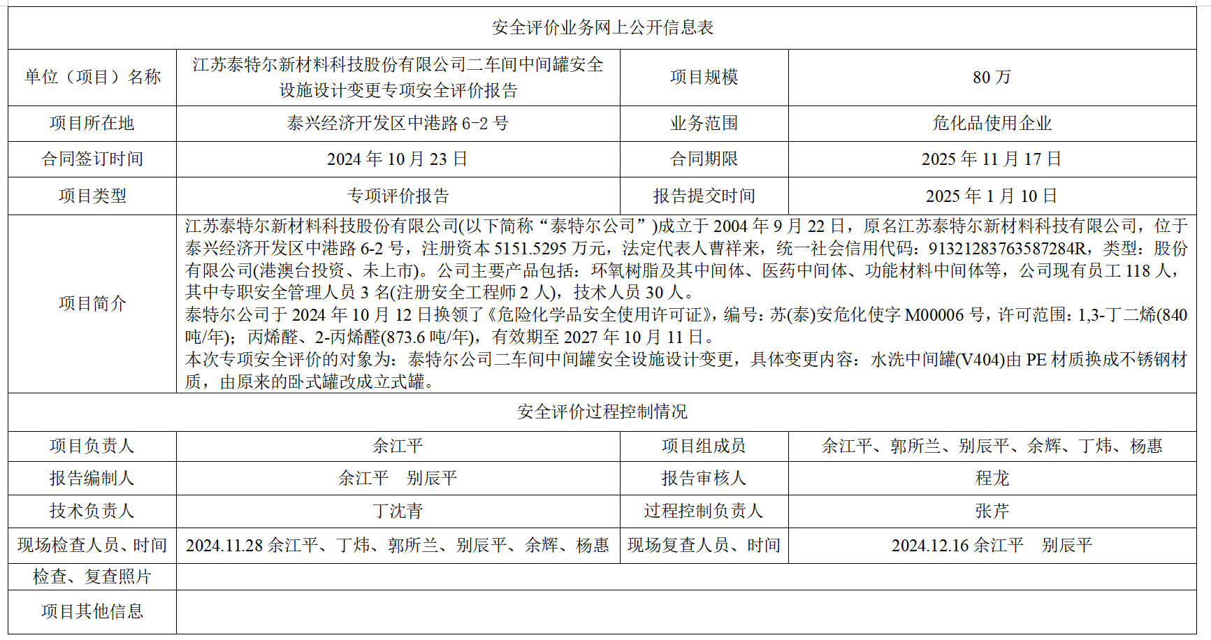 江苏泰特尔新材料科技股份有限公司二车间中间罐安全设施设计变更专项安全评价报告