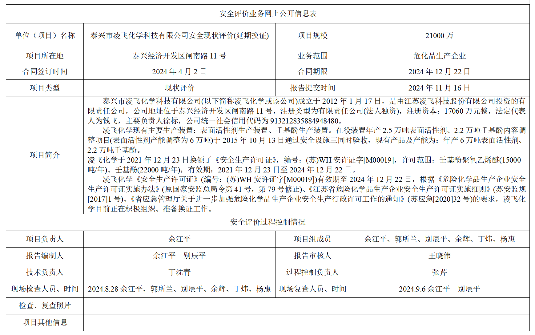 泰兴市凌飞化学科技有限公司安全现状评价(延期换证,2024)