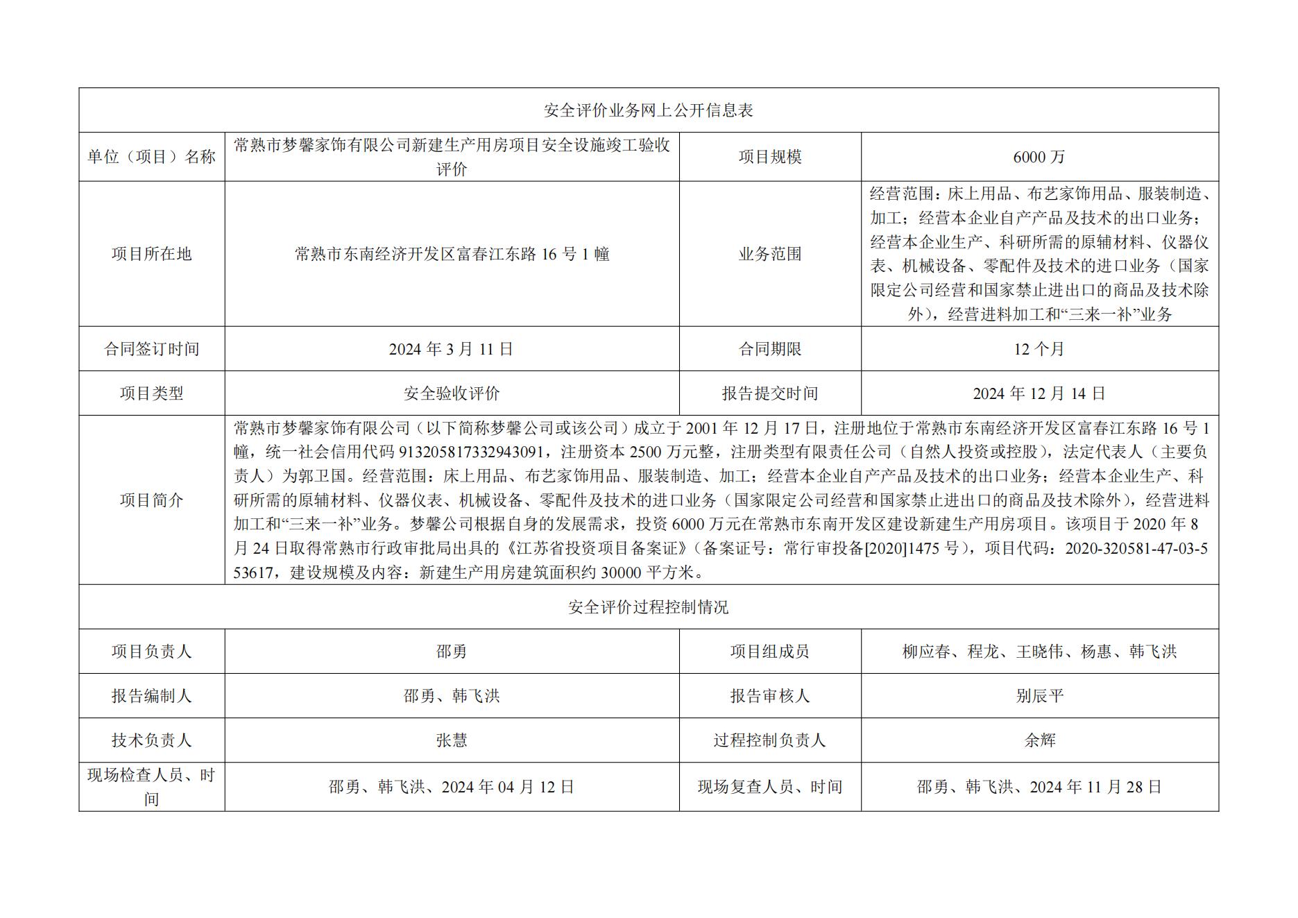 常熟市梦馨家饰有限公司新建生产用房项目安全设施竣工验收评价