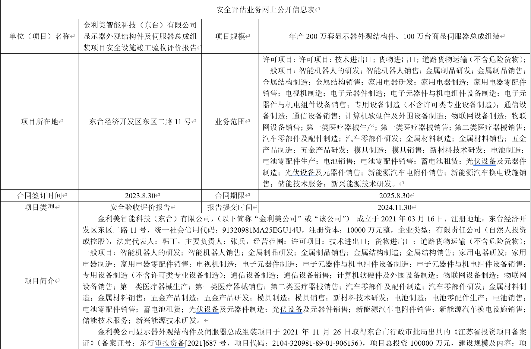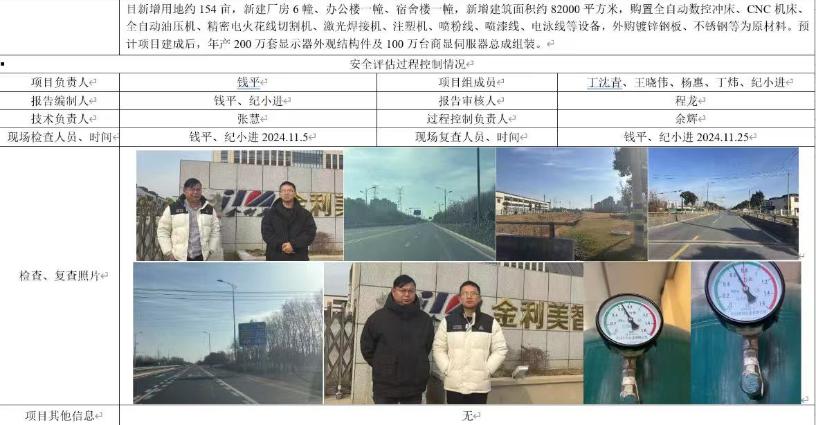 金利美智能科技(东台)有限公司 显示器外观结构件及伺服器总成组装项目安全设施竣工验收评价报告