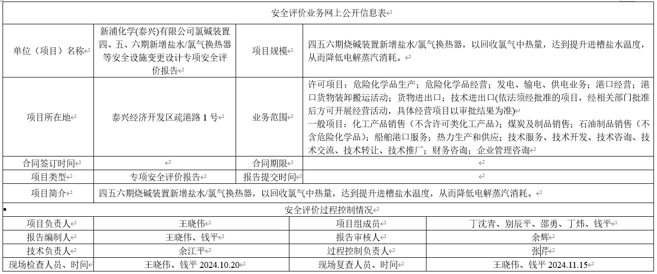 新浦化学(泰兴)有限公司氯碱装置四、五、六期新增盐水/氯气换热器等安全设施变更设计专项安全评价报告