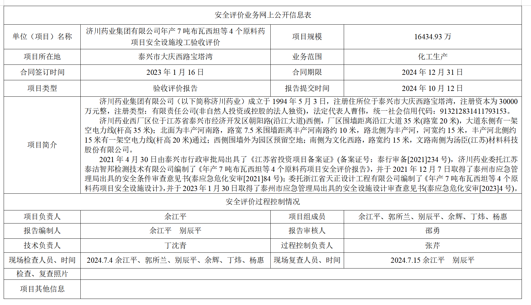 济川药业集团有限公司年产7吨布瓦西坦等4个原料药项目安全设施竣工验收评价