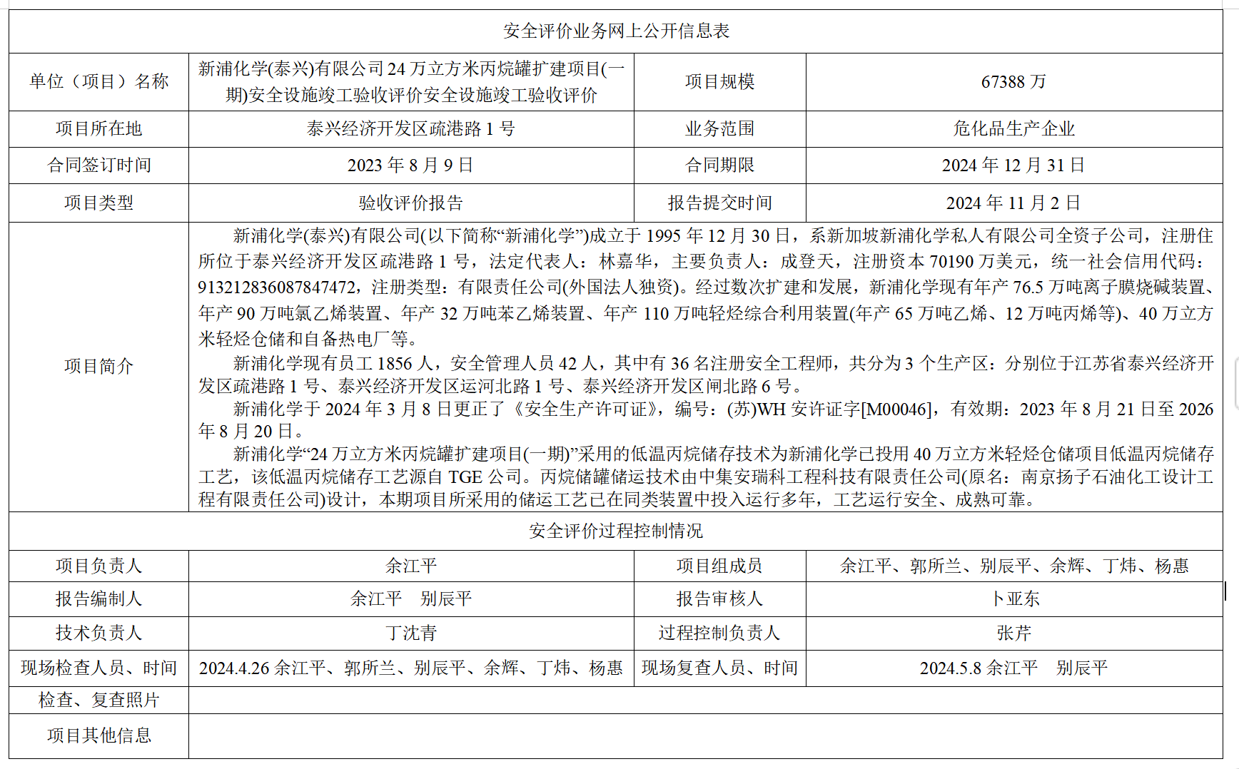 新浦化学(泰兴)有限公司24万立方米丙烷罐扩建项目(一期)安全设施竣工验收评价安全设施竣工验收评价