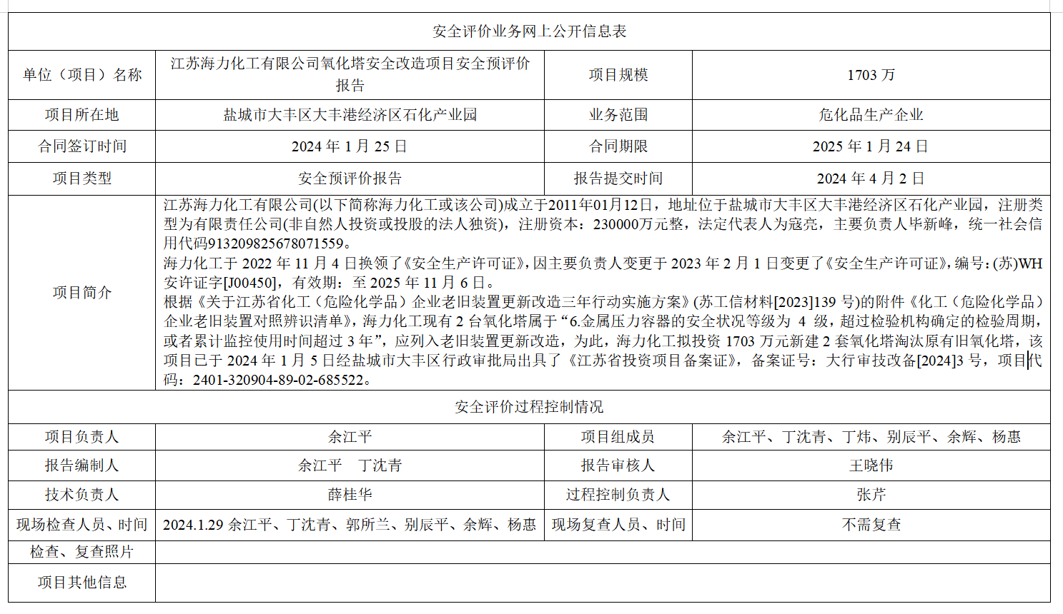 江苏海力化工有限公司氧化塔安全改造项目安全预评价报告