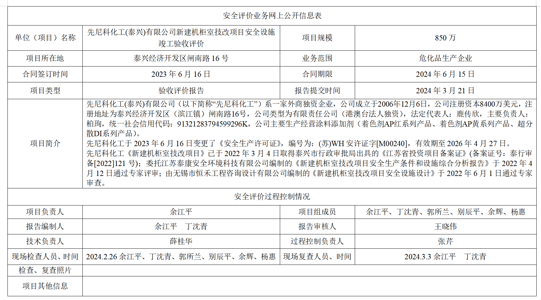 先尼科化工(泰兴)有限公司新建机柜室技改项目安全设施竣工验收评价
