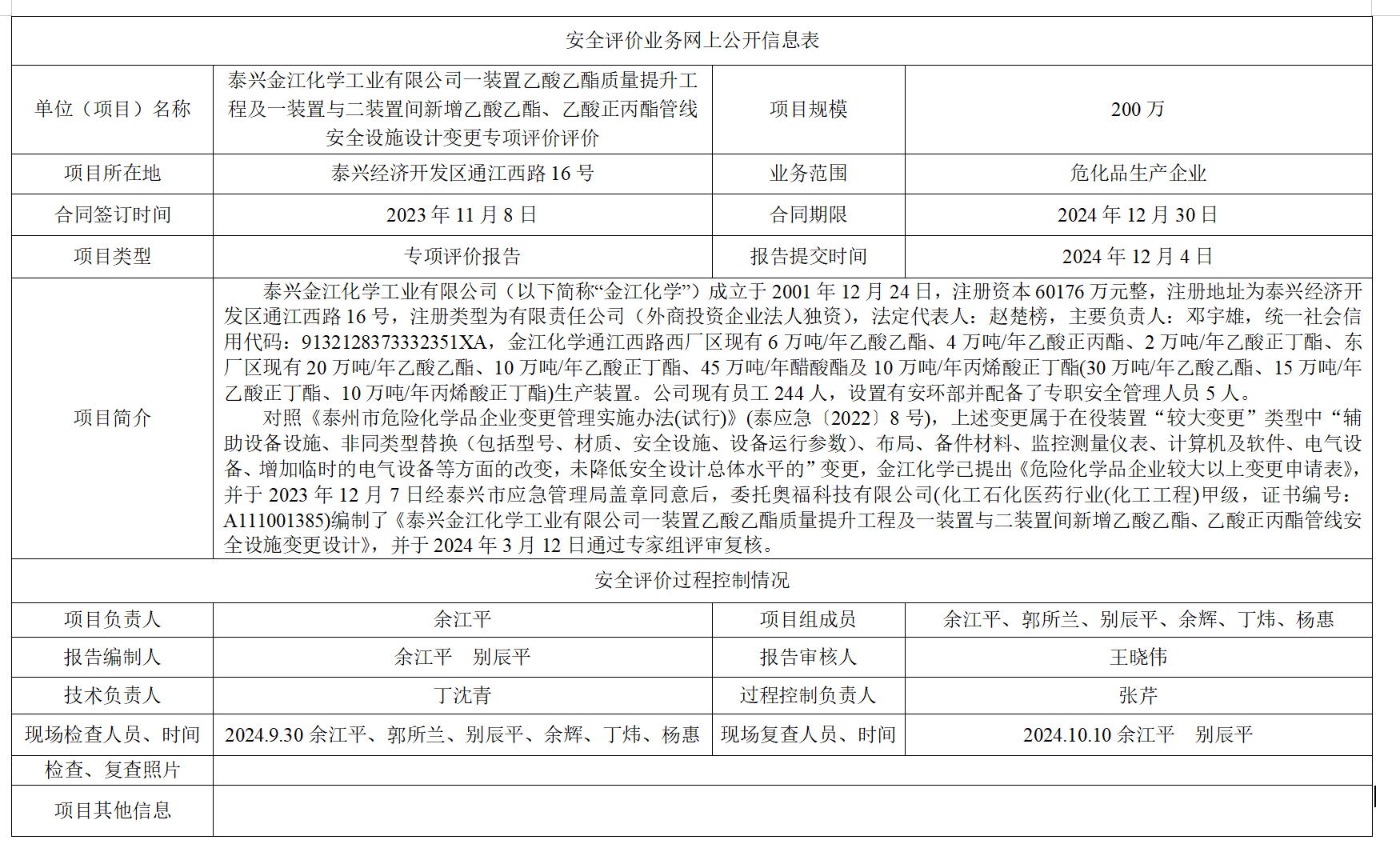 泰兴金江化学工业有限公司一装置乙酸乙酯质量提升工程及一装置与二装置间新增乙酸乙酯、乙酸正丙酯管线安全设施设计变更专项评价