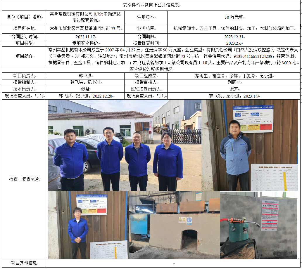 《常州常墅机械有限公司0.75t中频炉及周边配套设施专项安全评价报告