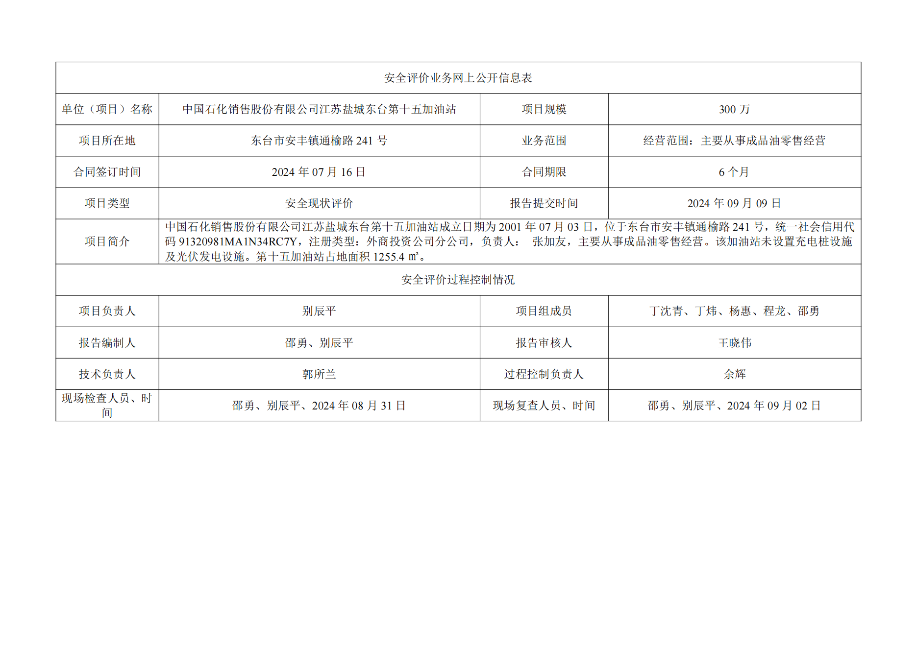 中国石化销售股份有限公司江苏盐城东台第十五加油站安全评价报告