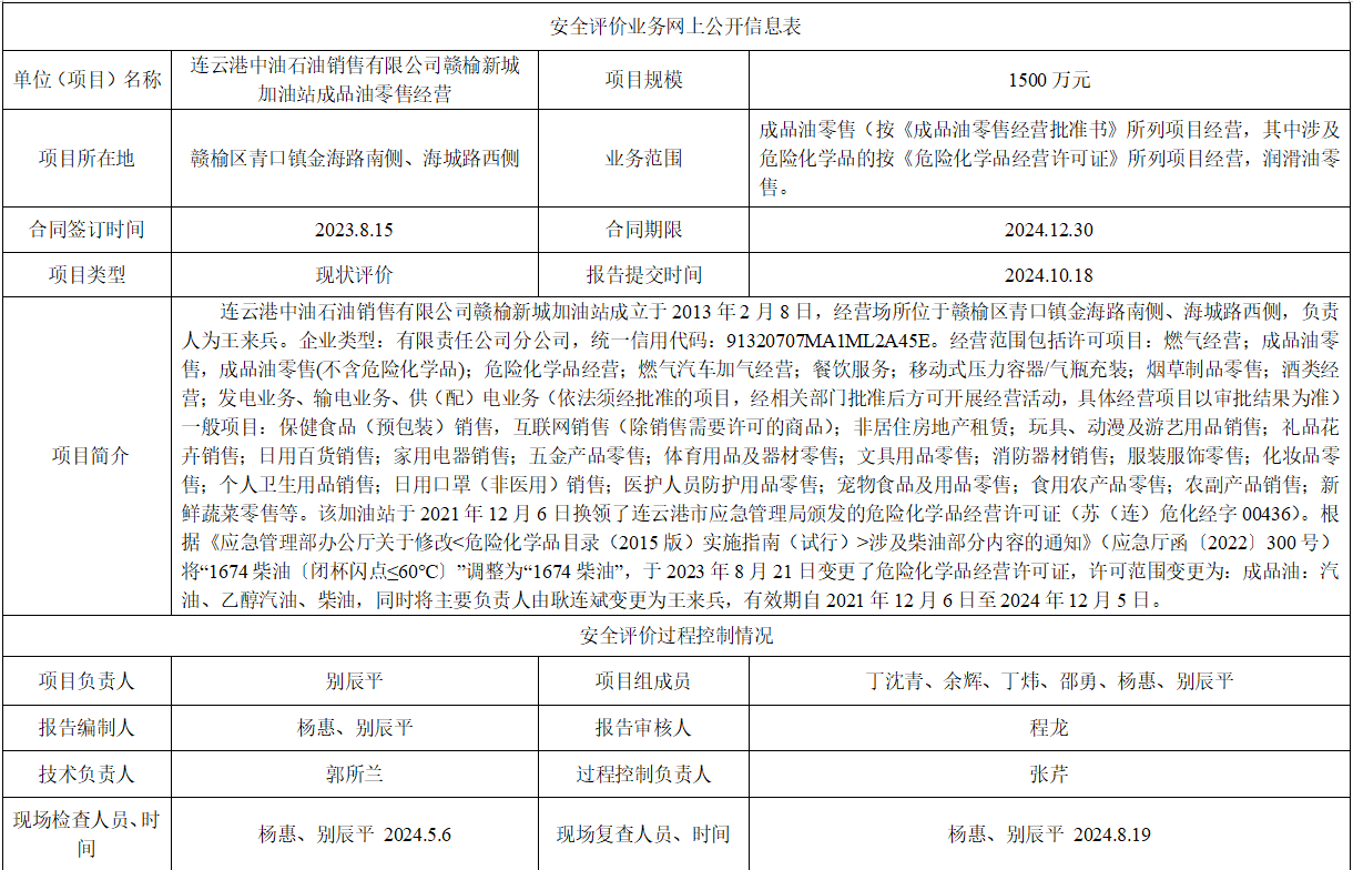 连云港中油石油销售有限公司赣榆新城加油站成品油零售经营项目安全评价报告