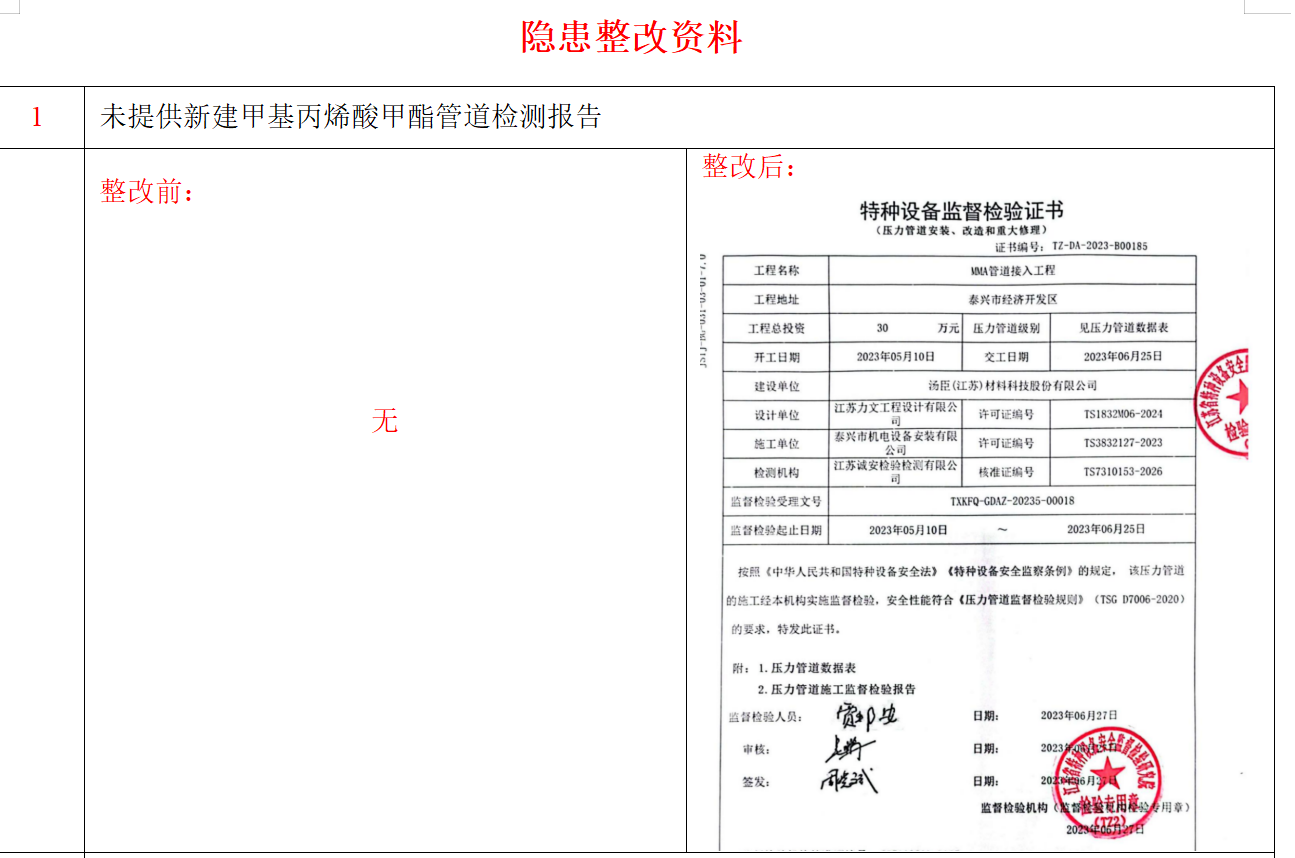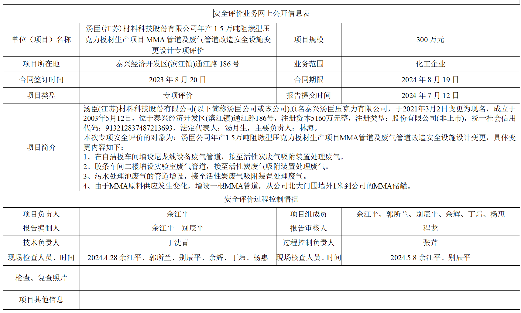 汤臣(江苏)材料科技股份有限公司年产1.5万吨阻燃型压克力板材生产项目MMA管道及废气管道改造安全设施变更设计专项评价