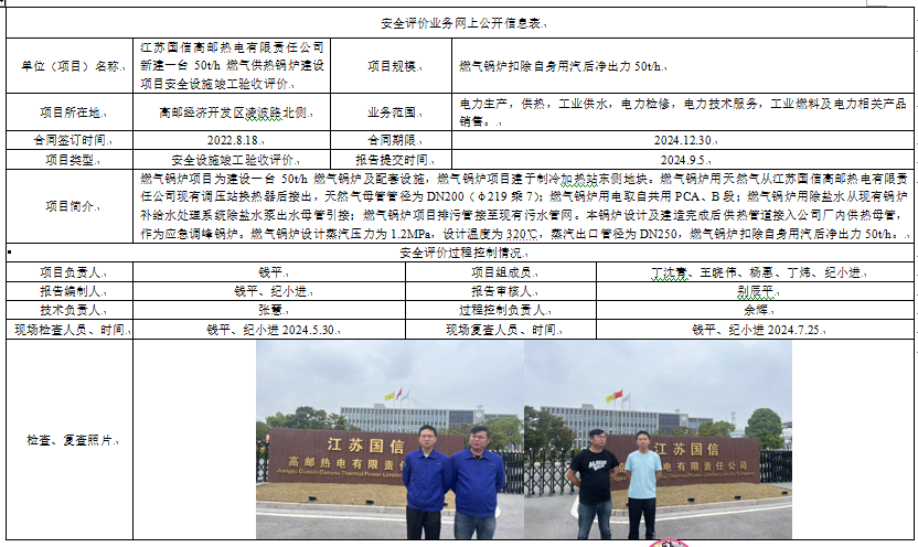 江苏国信高邮热电有限责任公司新建一台50t/h燃气供热锅炉建设项目安全设施竣工验收评价报告