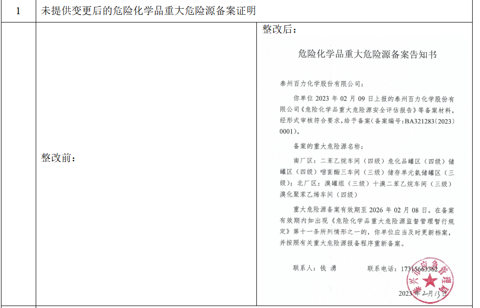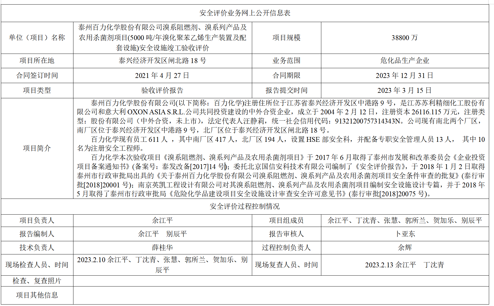 泰州百力化学股份有限公司溴系阻燃剂、溴系列产品及农用杀菌剂项目(5000吨/年溴化聚苯乙烯生产装置及配套设施)安全设施竣