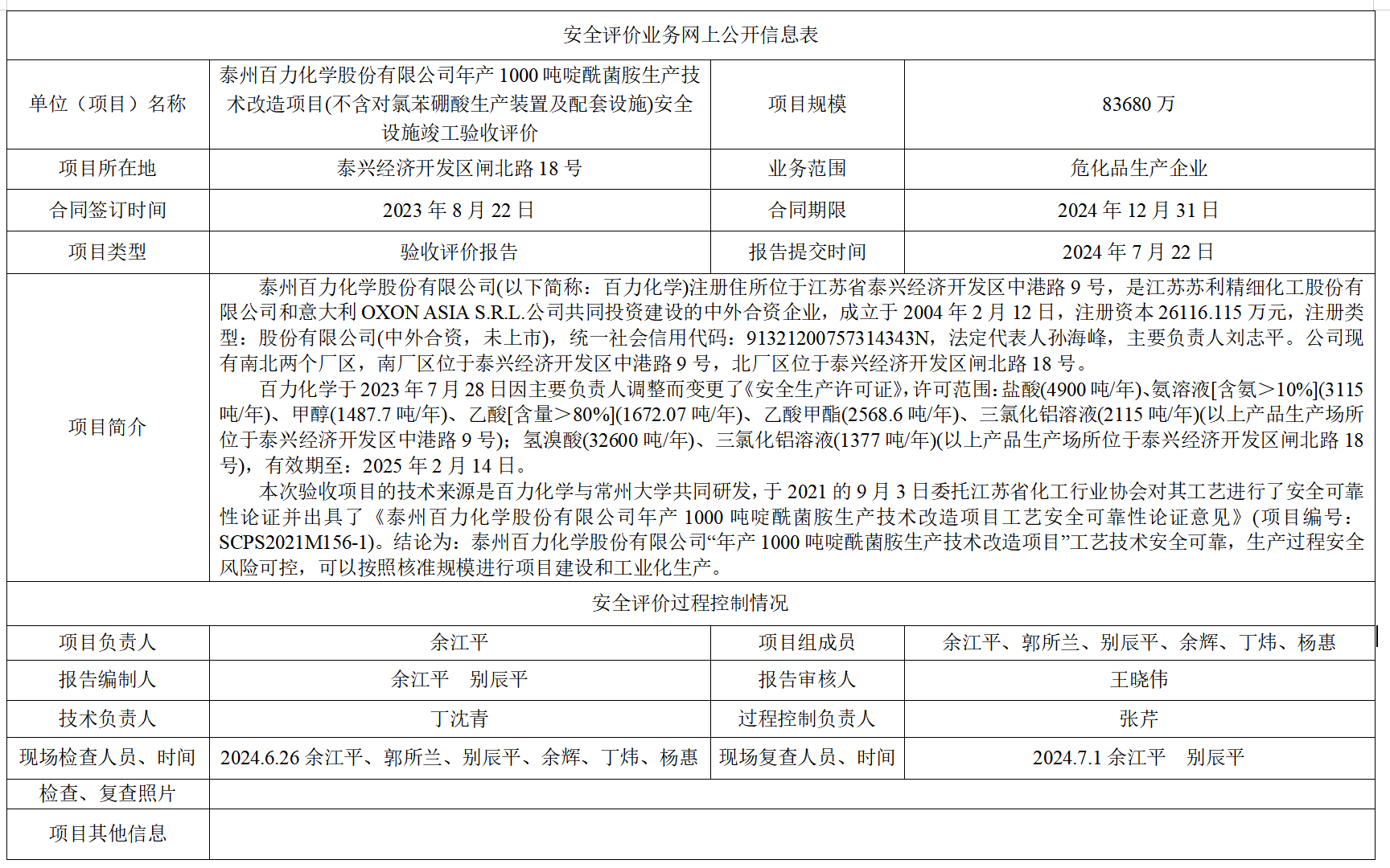 泰州百力化学股份有限公司年产1000吨啶酰菌胺生产技术改造项目(不含对氯苯硼酸生产装置及配套设施)安全设施竣工验收评价