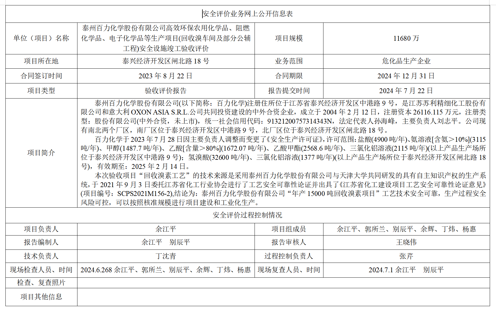 泰州百力化学股份有限公司高效环保农用化学品、阻燃化学品、电子化学品等生产项目(回收溴车间及部分公辅工程)安全设施竣工验收评价