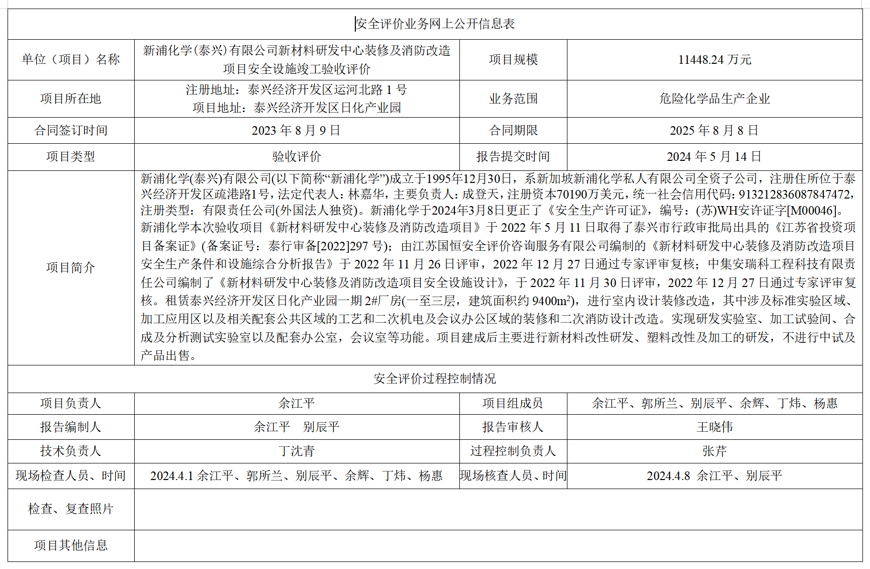 新浦化学(泰兴)有限公司新材料研发中心装修及消防改造项目安全设施竣工验收评价