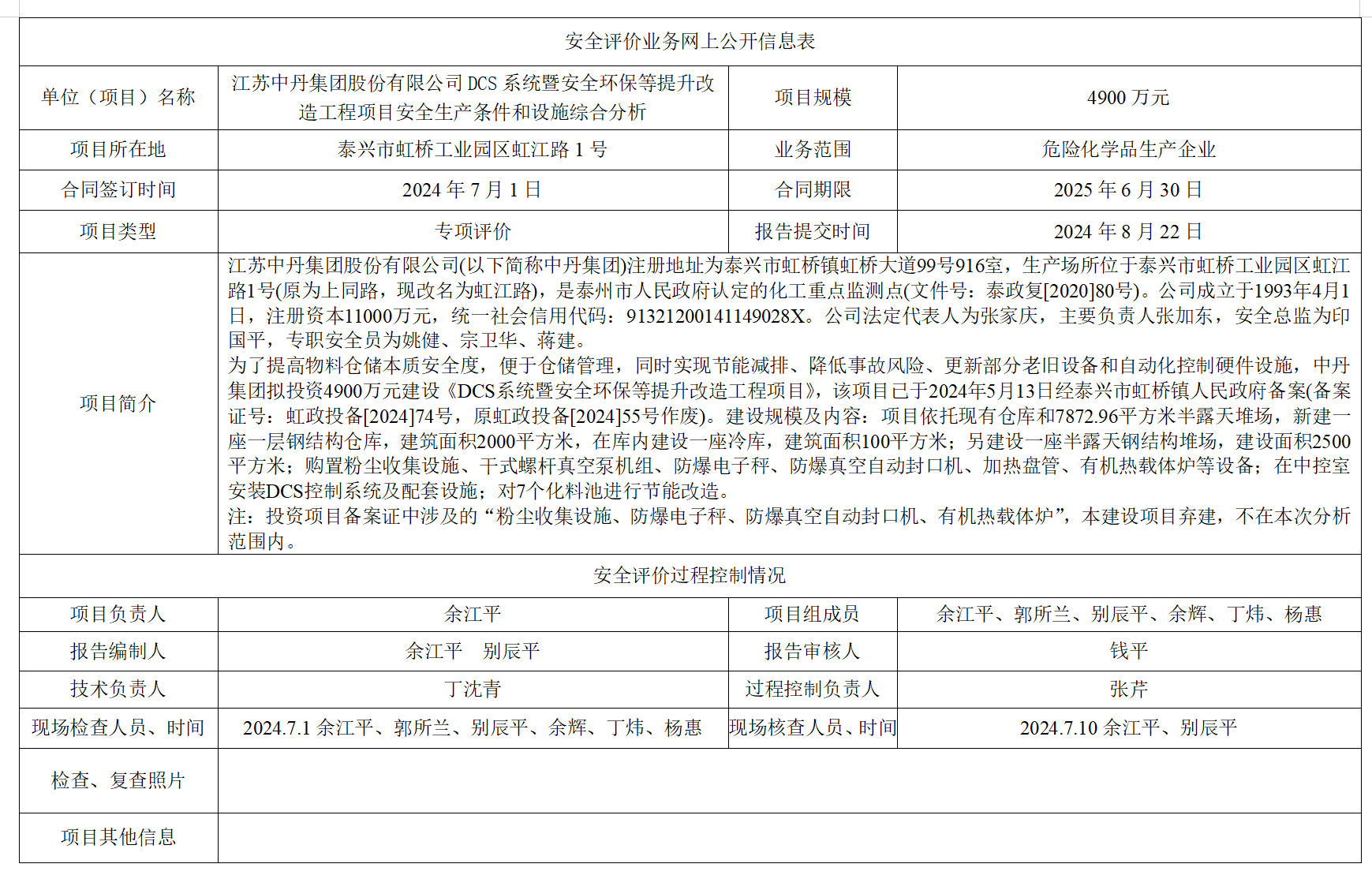 江苏中丹集团股份有限公司DCS系统暨安全环保等提升改造工程项目安全生产条件和设施综合分析