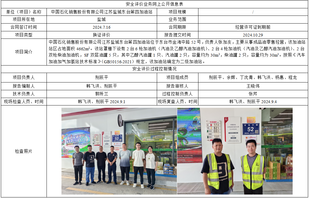 中国石化销售股份有限公司江苏盐城东台第四加油站换证评价