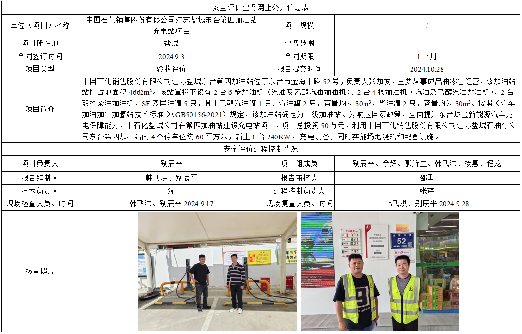 中国石化销售股份有限公司江苏盐城东台第四加油站充电站项目验收评价