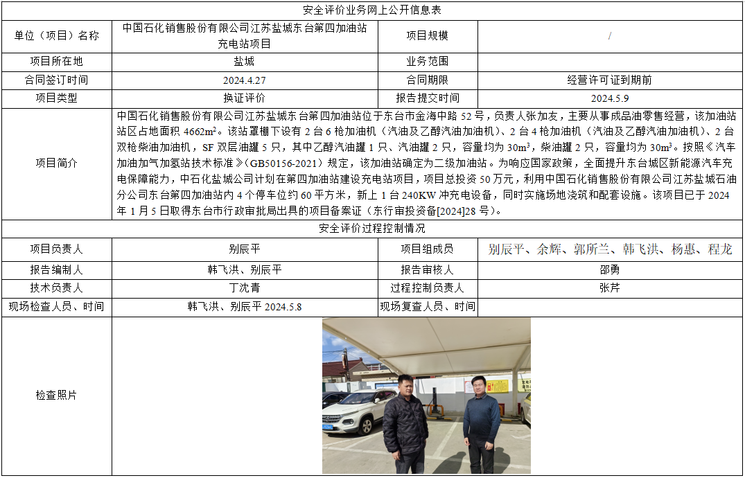中国石化销售股份有限公司江苏盐城东台第四加油站充电站项目