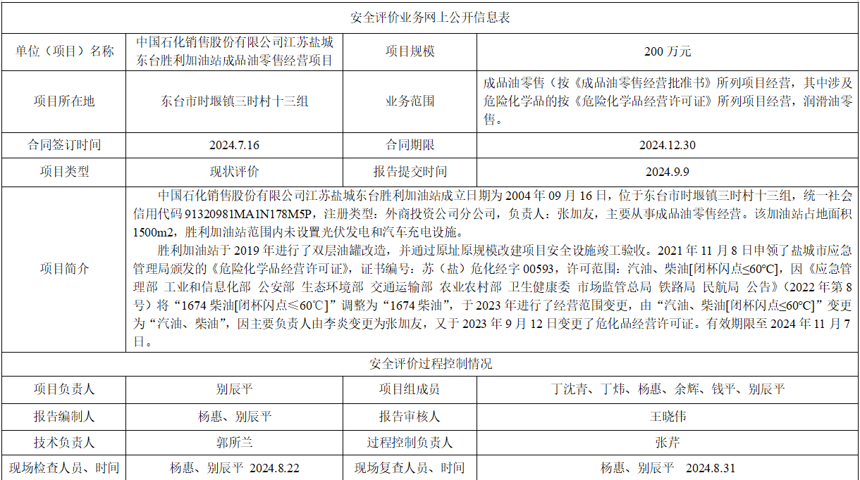 中国石化销售股份有限公司江苏盐城东台胜利加油站成品油零售经营项目