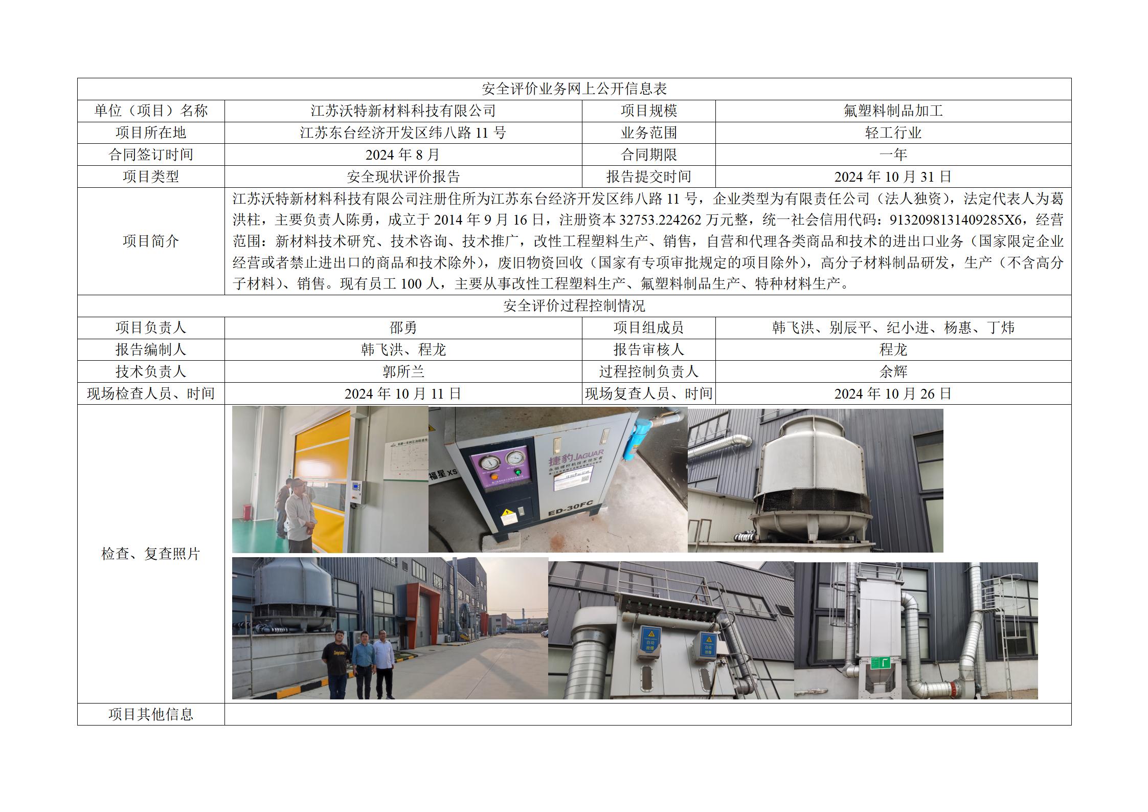 江苏沃特新材料科技有限公司氟塑料制品生产项目安全现状评价报告