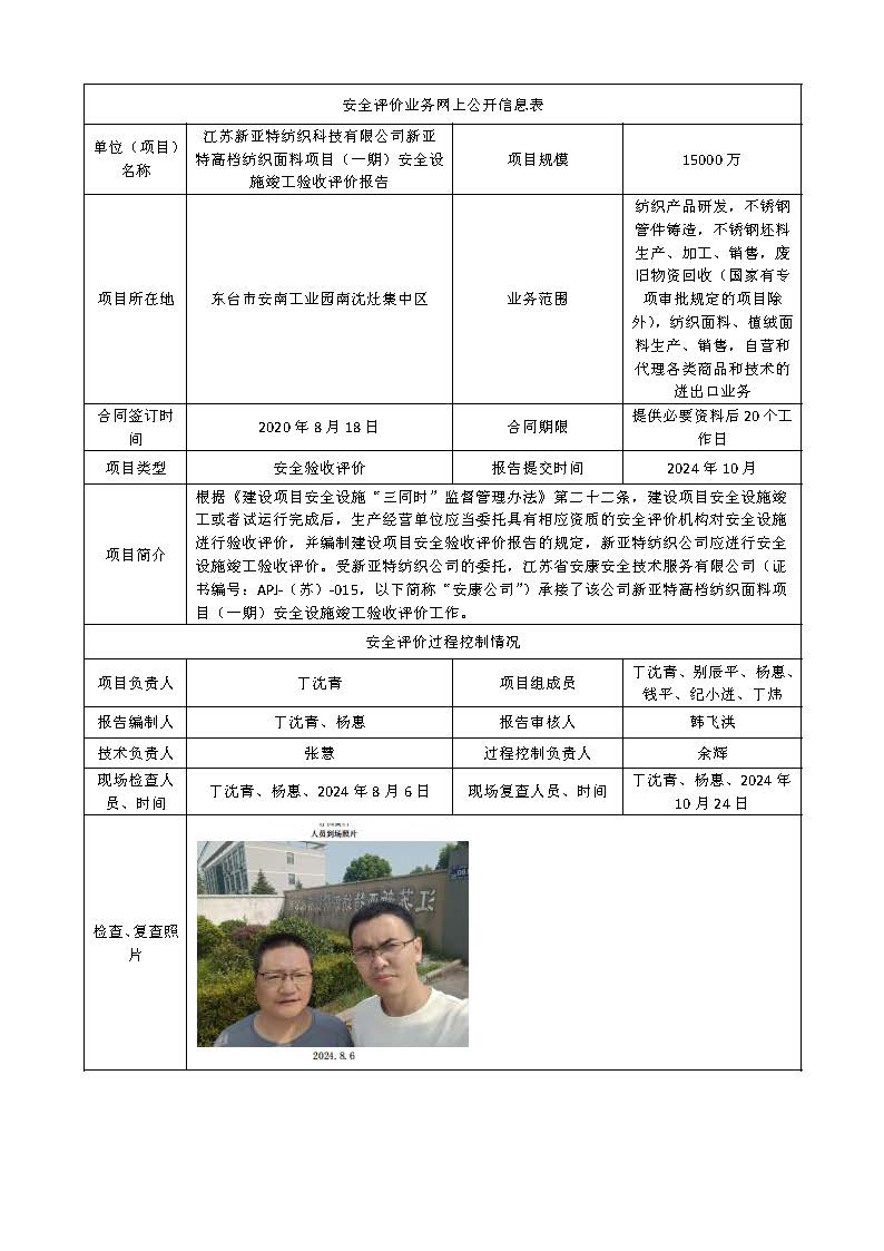 江苏新亚特纺织科技有限公司新亚特高档纺织面料项目(一期)安全设施竣工验收评价报告