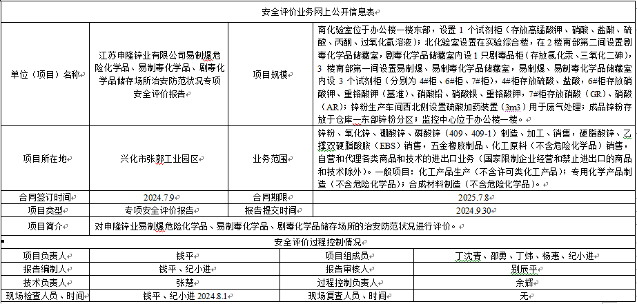 江苏申隆锌业有限公司易制爆危险化学品、易制毒化学品、剧毒化学品储存场所治安防范状况专项安全评价报告