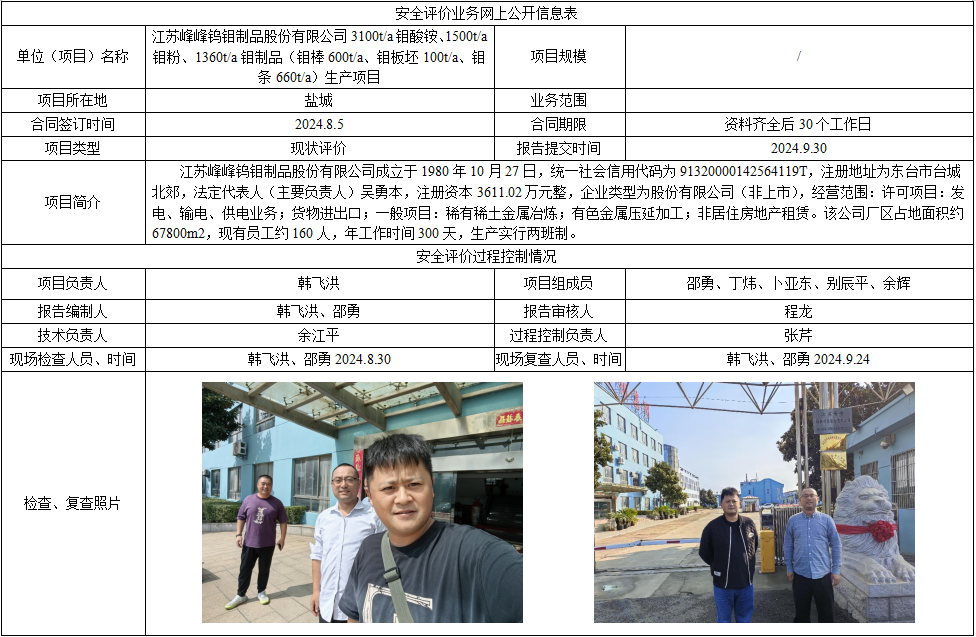 江苏峰峰钨钼制品股份有限公司3100t/a钼酸铵、1500t/a钼粉、1360t/a钼制品(钼棒600t/a、钼板坯100t/a、钼条660t/a)生产项目