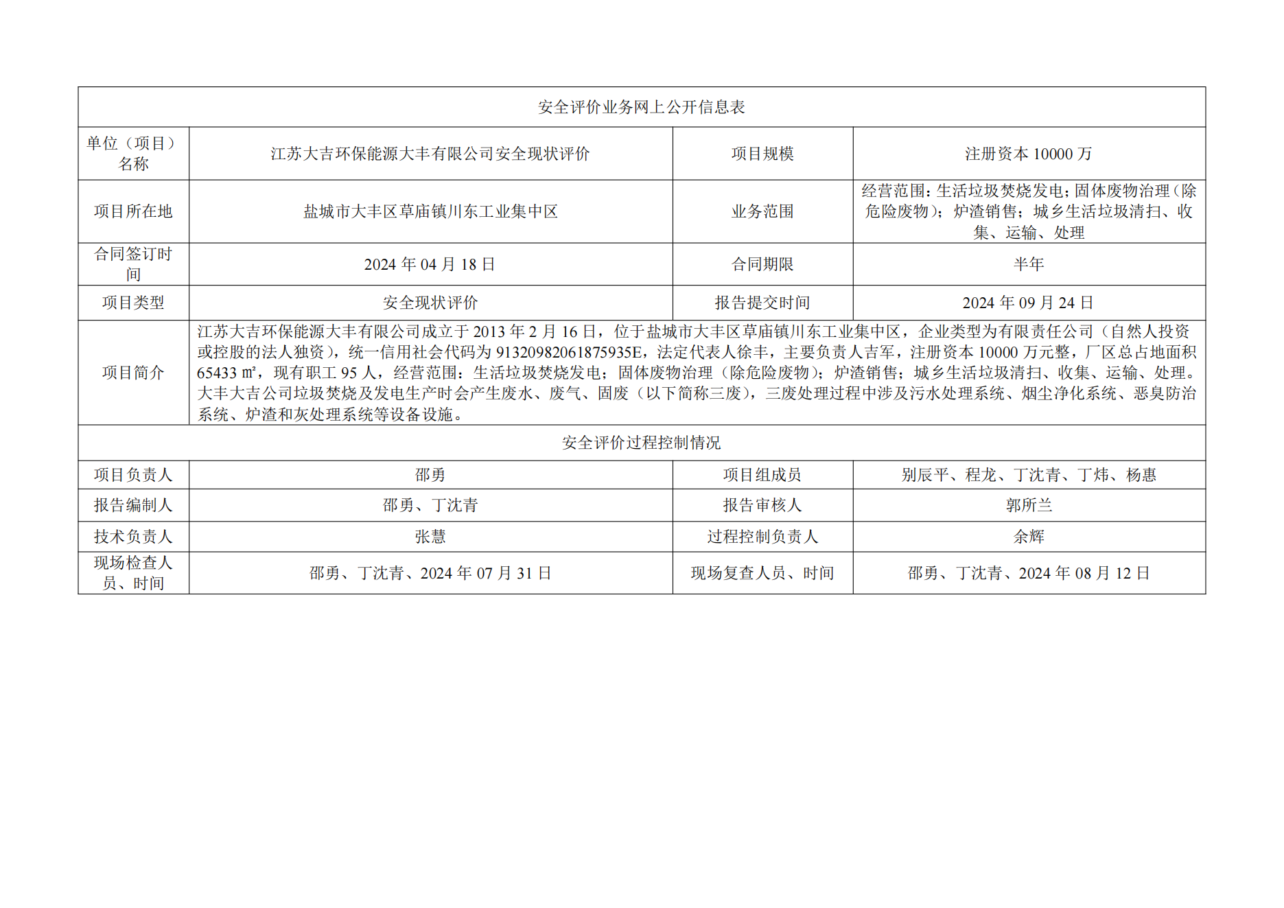 江苏大吉环保能源大丰有限公司环保设施专项安全评价报告