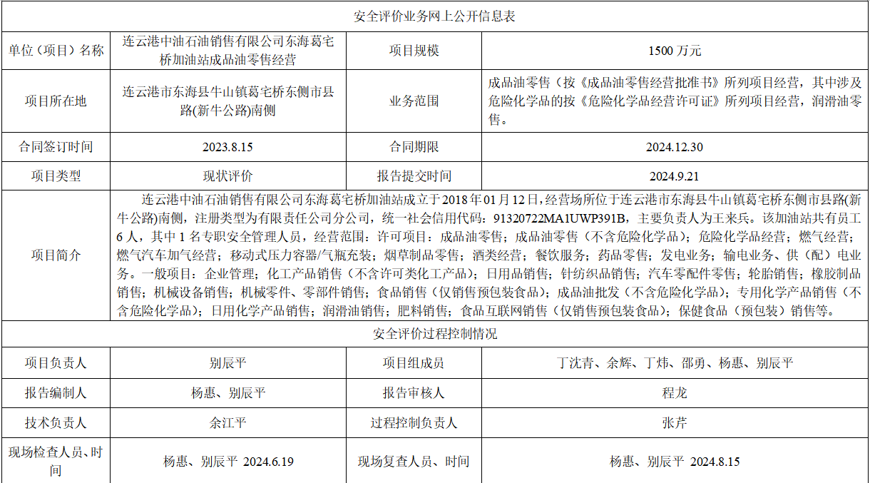 连云港中油石油销售有限公司东海葛宅桥加油站成品油零售经营安全现状评价报告