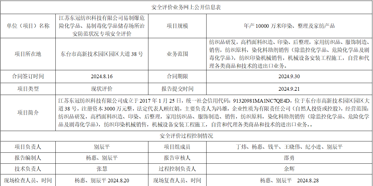 江苏东冠纺织科技有限公司易制爆危险化学品、易制毒化学品储存场所治安防范状况专项安全评价