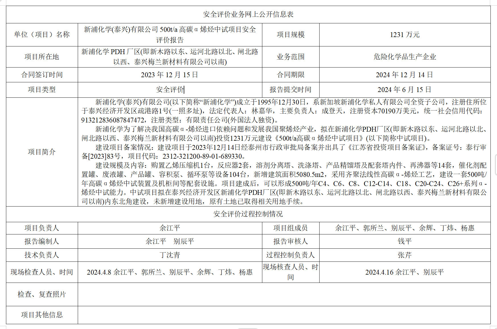 新浦化学(泰兴)有限公司500t/a高碳α烯烃中试项目安全评价报告