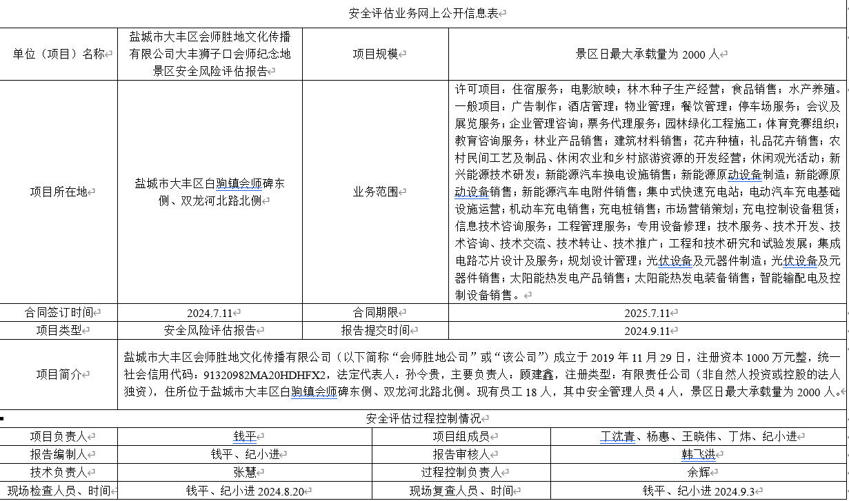 盐城市大丰区会师胜地文化传播有限公司大丰狮子口会师纪念地景区安全风险评估报告
