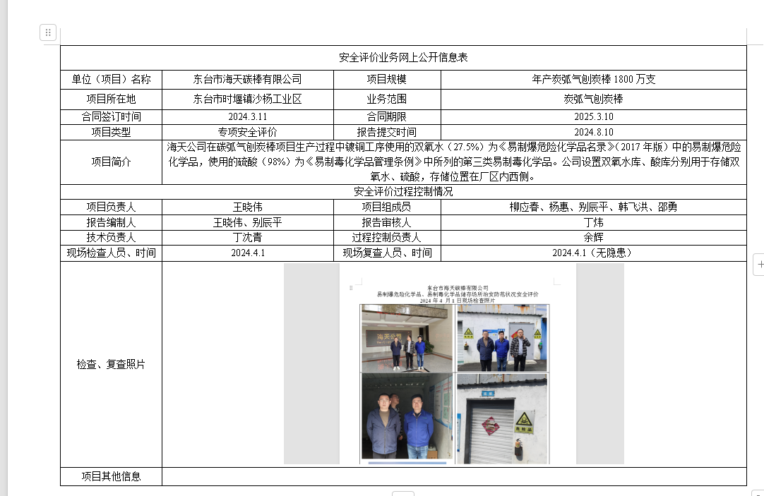 东台市海天碳棒有限公司易制爆危险化学品、易制毒化学品储存场所治安防范状况专项安全评价