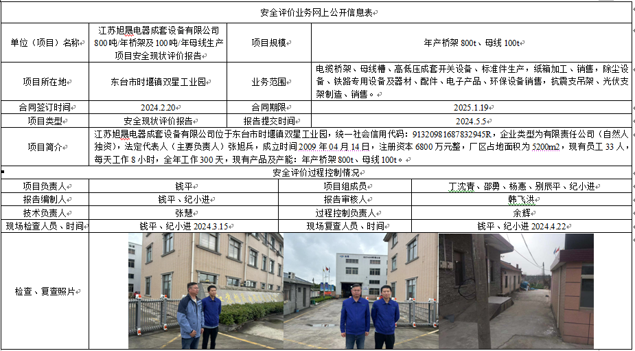 江苏旭晟电器成套设备有限公司800吨/年桥架及100吨/年母线生产项目安全现状评价报告